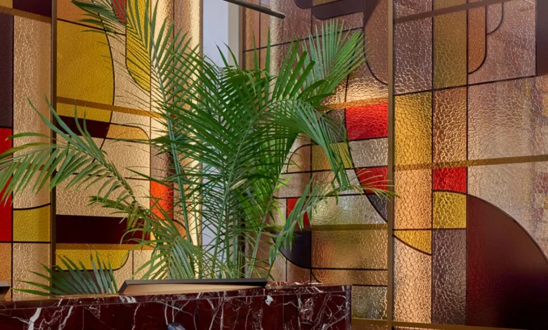 The centerpiece of the entry sequence is a richly veined wooden reception desk, which serves as an identifiable beacon for arriving guests. This element is framed by a geometric stained glass wall that echoes the patterns found in the tile flooring. This backdrop is heavily influenced by the Bauhaus movement, utilizing primary shapes and disciplined lines to refract both natural light from the Fourth Avenue windows and indirect artificial light from within.